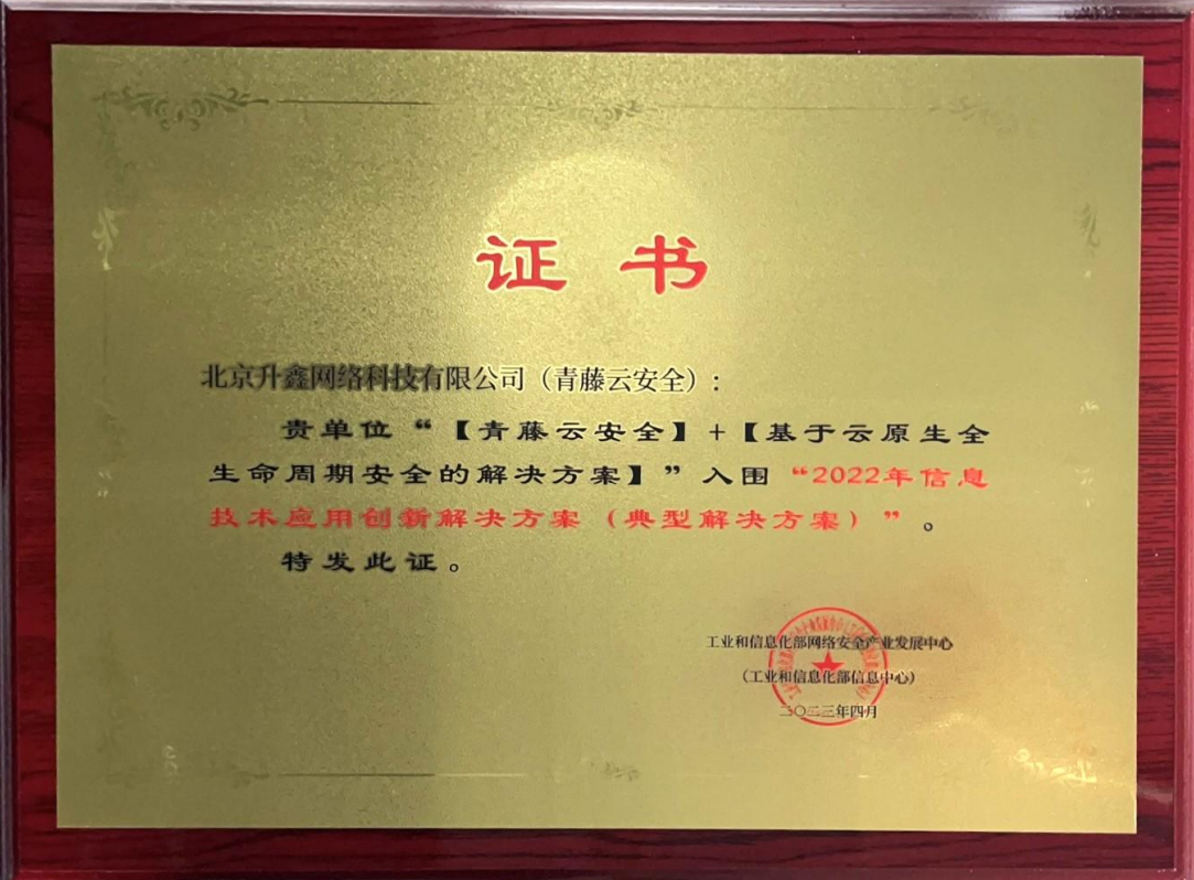 近日,工业和信息化部网络安全产业发展中心(工业和信息化部信息中心)发布了 2022年(第四届)信息技术应用创新解决方案入选名单,青藤云安全提交的“基于云原生全生命周期安全的解决方案”凭借其技术前瞻性、产业带动性、示范意义、推广价值等多项指标,成功入选“2022年信息技术应用创新解决方案(典型解决方案)”,再一次展现了青藤在云安全领域的专业能力和综合实力。